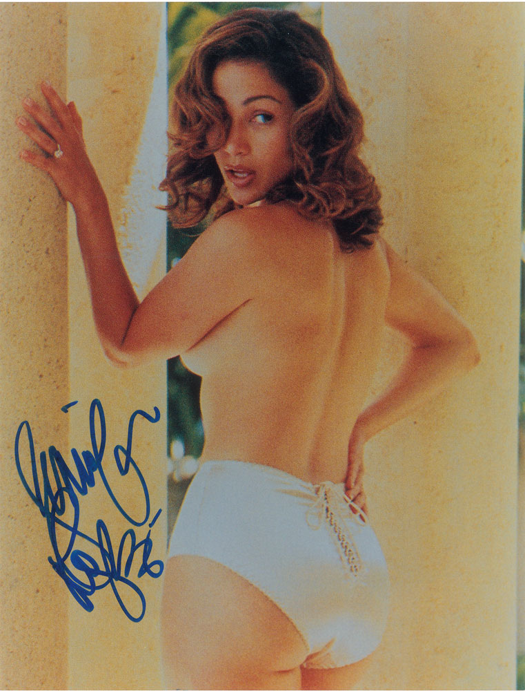 Revealing color satin-finish 10.75 x 14 photo of Lopez as she was pictured in an issue of Vanity Fair from July 1998, signed in blue felt tip. In fine condition, with somewhat grainy image quality. From The John Brennan In-person Autograph Collection.