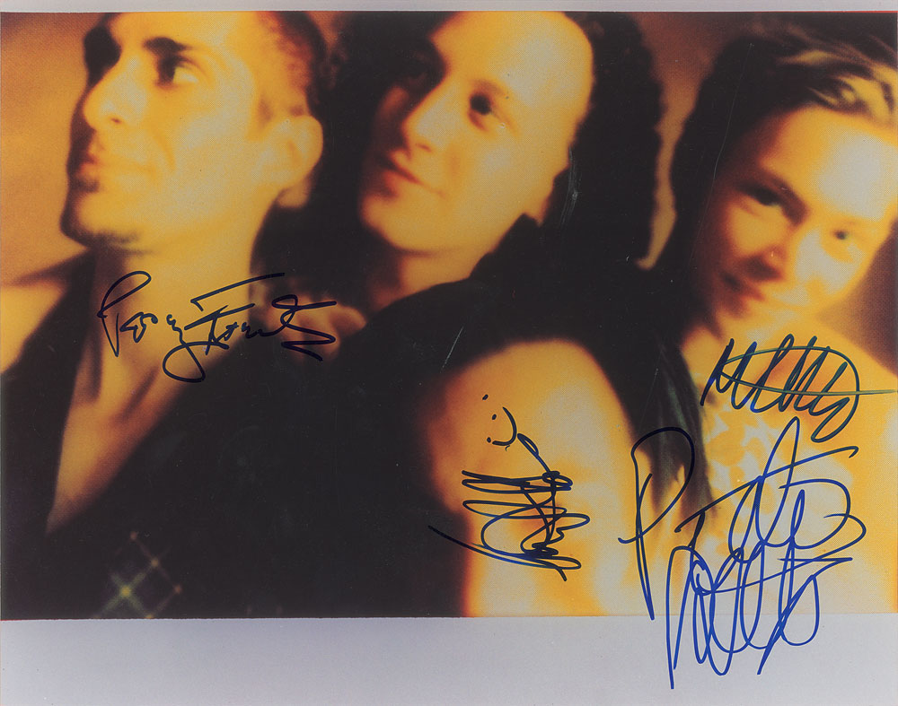 Color glossy 14 x 11 band photo of Porno for Pyros, signed in blue felt tip by Peter DiStefano, Perry Farrell, Martyn LeNoble, and Stephen Perkins. In fine condition. From The John Brennan In-person Autograph Collection.