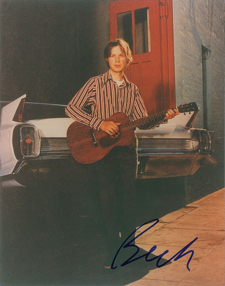 Color glossy 8 x 10 photo of Beck posing with an acoustic guitar at the rear of a classic car, signed in blue felt tip, "Beck." In fine condition. From The John Brennan In-person Autograph Collection.