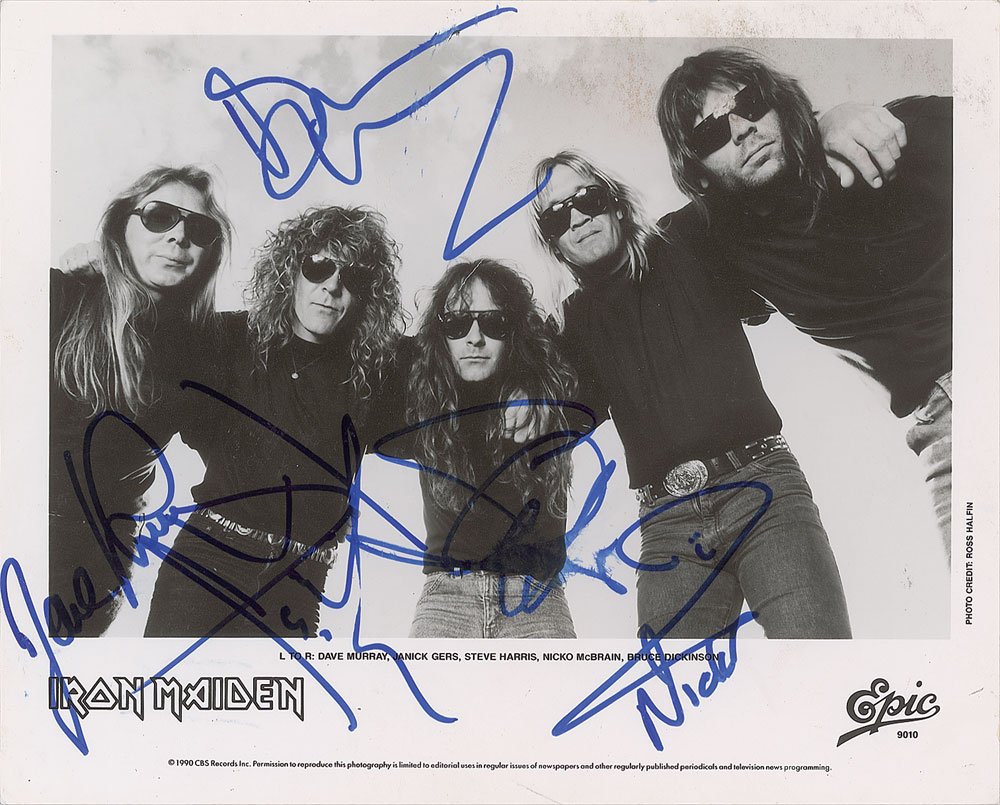 Satin-finish 10 x 8 Epic Records publicity photo of Iron Maiden, signed in blue felt tip by Steve Harris, Dave Murray, Bruce Dickinson, Nicko McBrain, and Janick Gers. In fine condition. From The John Brennan In-person Autograph Collection.
