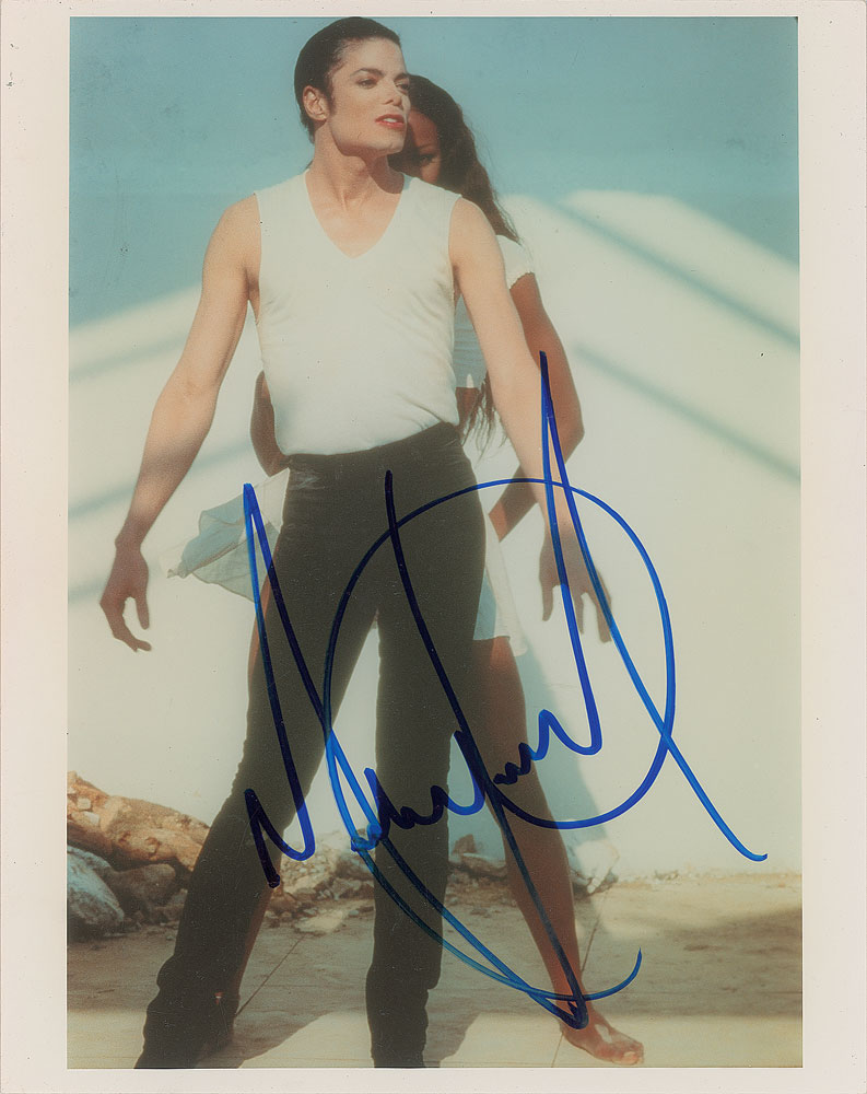Color glossy 8 x 10 photo of Michael Jackson standing in front of model Naomi Campbell during the steamy video for his 1992 single 'In the Closet,' prominently signed in blue felt tip by Jackson. In fine condition. From The John Brennan In-person Autograph Collection.