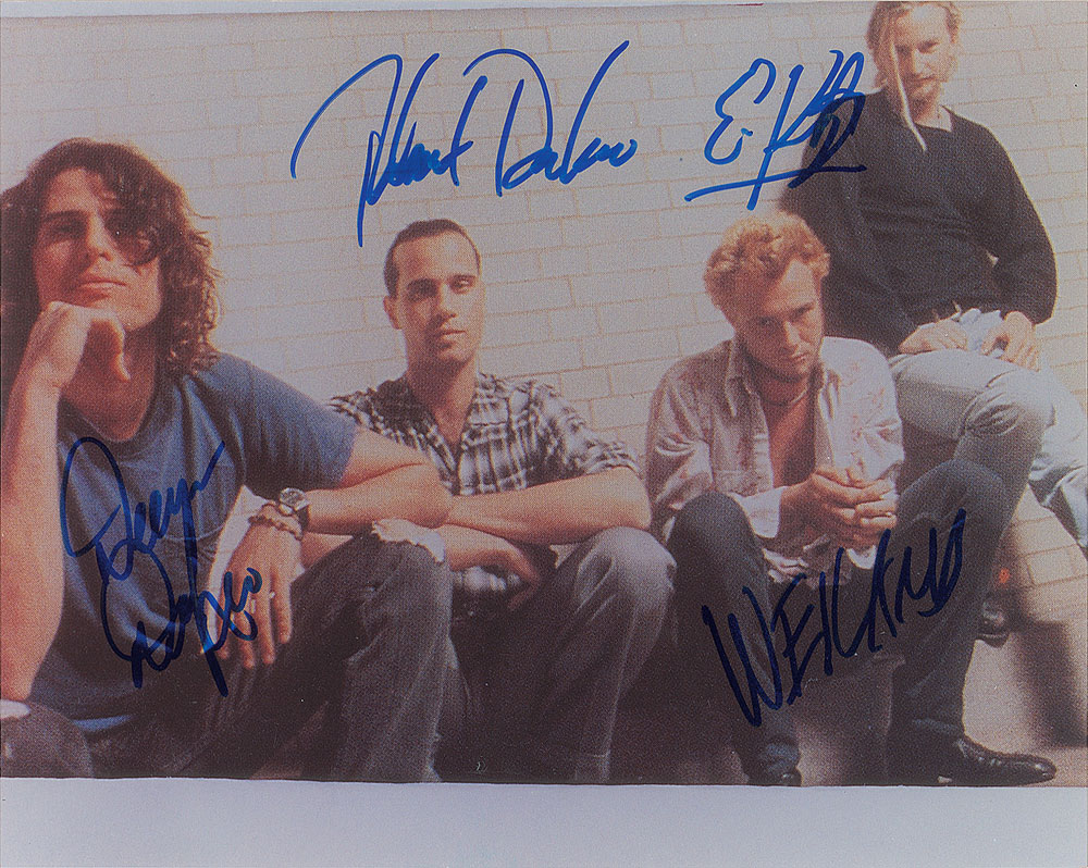 Color glossy 10 x 7.75 band photo of the original Stone Temple Pilots lineup, signed in blue felt tip by Scott Weiland, Dean DeLeo, Robert DeLeo, and Eric Kretz. In fine condition. From The John Brennan In-person Autograph Collection.