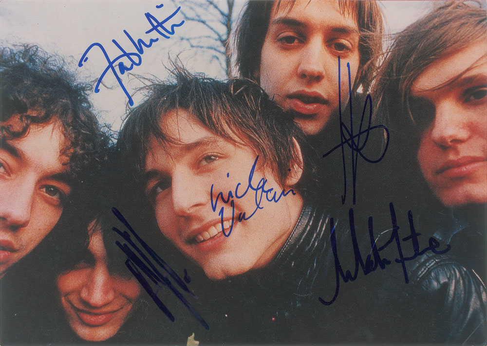 Color glossy 11.25 x 8 close-up photo of New York indie-rockers The Strokes, signed in felt tip by Julian Casablancas, Nick Valensi, Albert Hammond, Jr., Nikolai Fraiture, and Fabrizio Moretti. In fine condition. From The John Brennan In-person Autograph Collection.