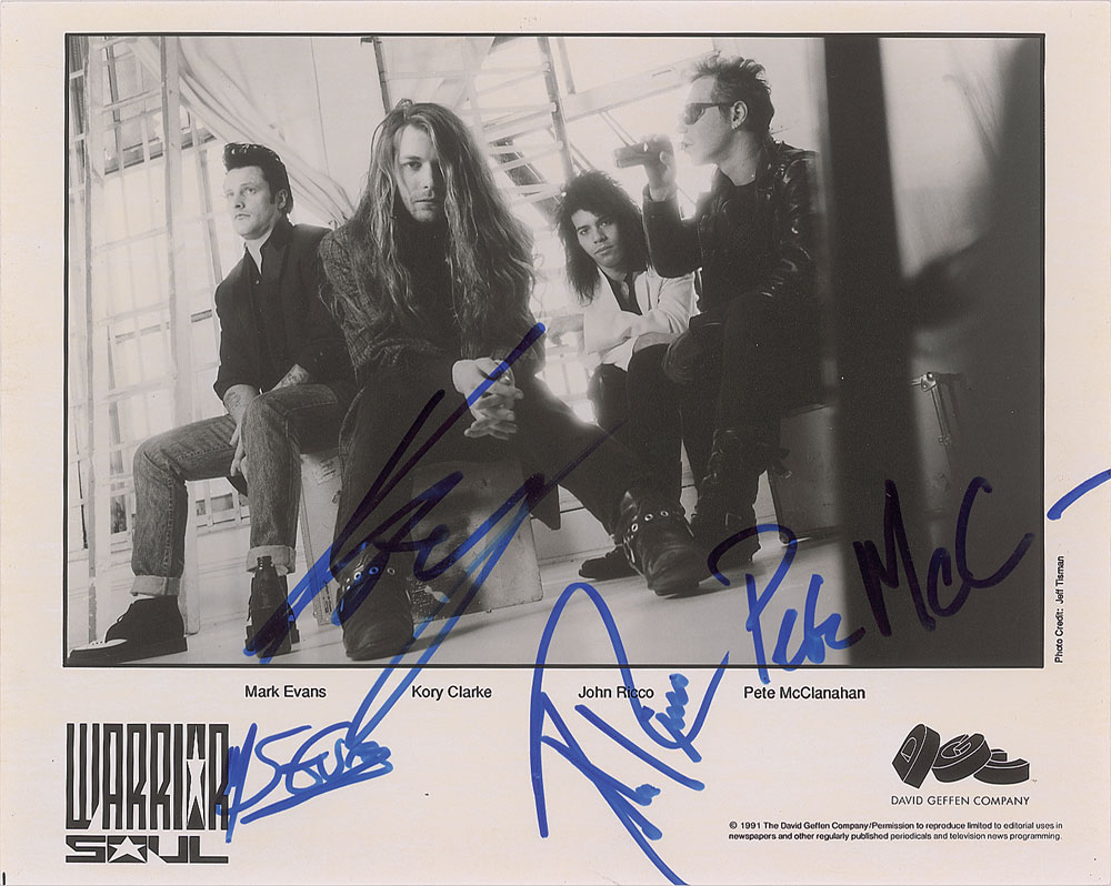 Satin-finish 10 x 8 David Geffen publicity photo of the alternative metal band Warrior Soul, signed in blue felt tip by Mark Evans, Kory Clarke, John Ricco, and Pete McClanahan. In fine condition. From The John Brennan In-person Autograph Collection.