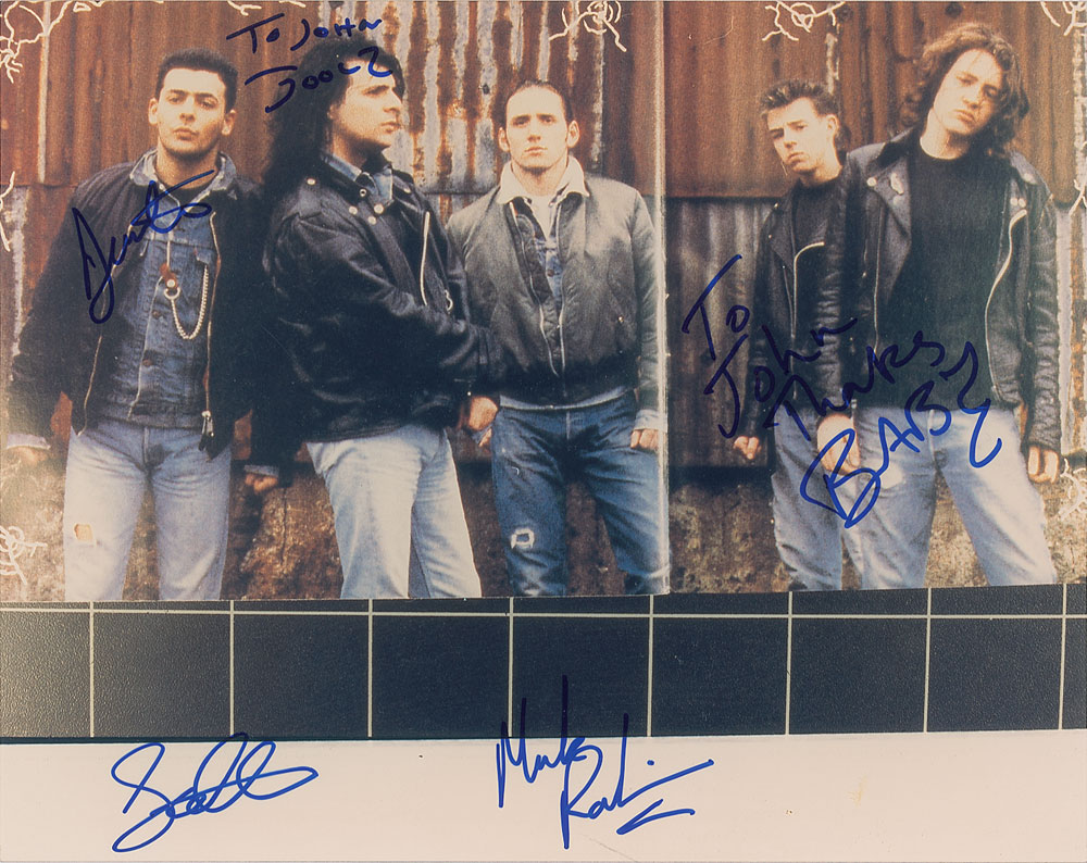 Color glossy 10 x 8 photo of the Scottish hard rockers, signed in blue felt tip by Mark Rankin, Giuliano 'Jools' Gizzi, Dante Gizzi, Scott Shields, and Baby Stafford, with Jools and Baby adding inscriptions to "John." In fine condition. From The John Brennan In-person Autograph Collection.