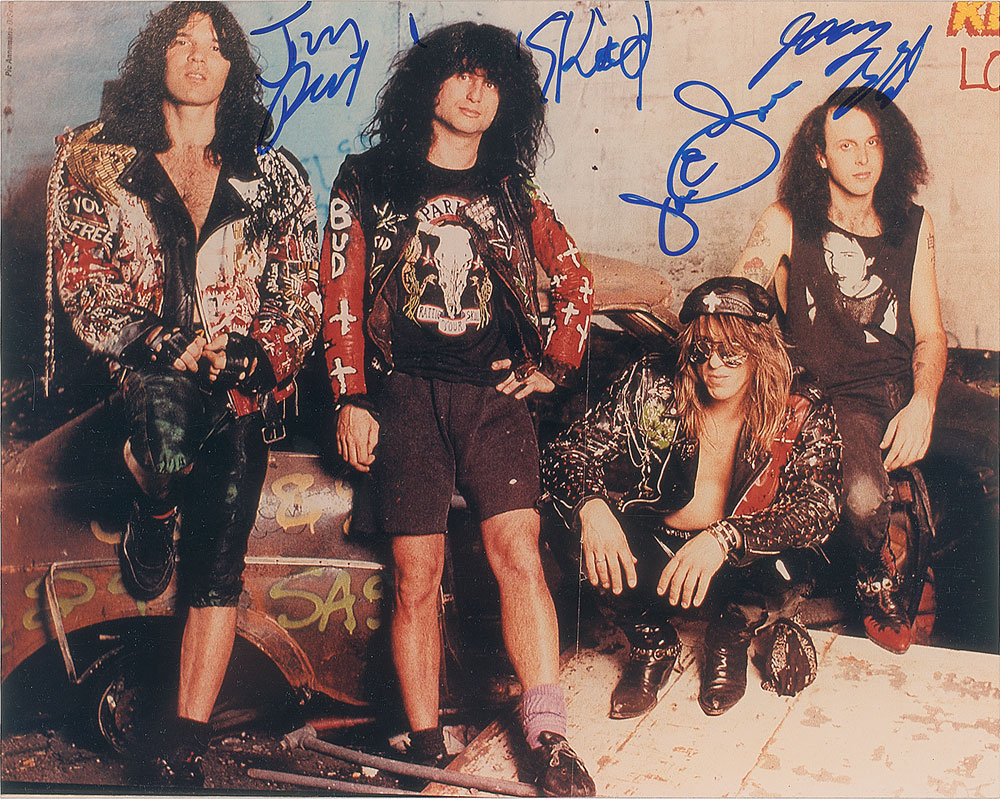 Color glossy 10 x 8 photo of the LA hard rock group Love/Hate, signed in blue felt tip by Jizzy Pearl, Skid, Jon E. Love, and Joey Gold. In fine condition. From The John Brennan In-person Autograph Collection.