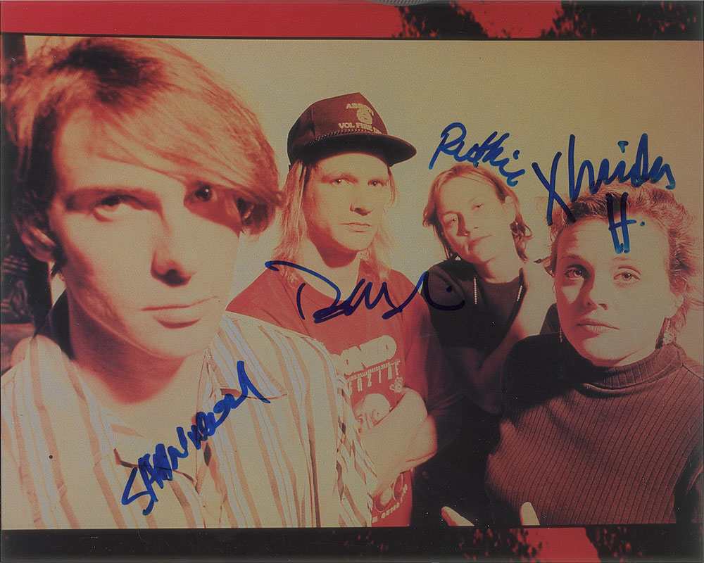 Color glossy 10 x 8 photo of Atlanta rock band Magnapoop, signed in blue felt tip by Linda Hopper, David McNair, Ruthie Morris, and Shannon Mulvaney. In fine condition. From The John Brennan In-person Autograph Collection.