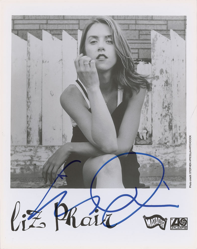 Glossy 8 x 10 Matador/Atlantic publicity photo showing Liz Phair sitting in front of a white picket fence, signed in blue felt tip. In fine condition, with slight edge toning. From The John Brennan In-person Autograph Collection.