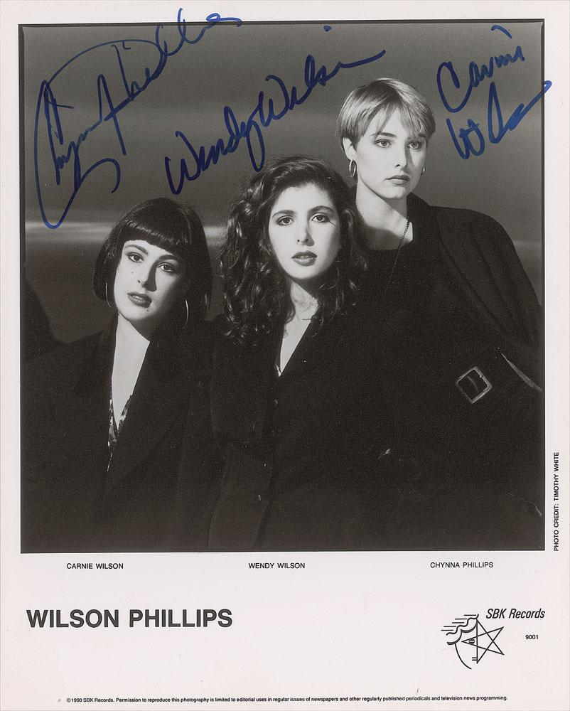 Satin-finish 8 x 10 SBK Records publicity photo of vocalist trio Wilson Phillips, signed in blue felt tip by Carnie Wilson, Wendy Wilson, and Chynna Phillips. In fine condition. From The John Brennan In-person Autograph Collection.
