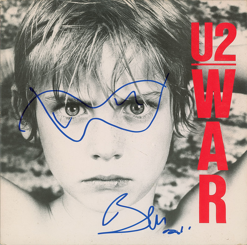 War album signed on the front cover in blue felt tip by Bono, who sketches a pair of his trademark sunglasses on the boy's face. In fine condition. The record is included.
