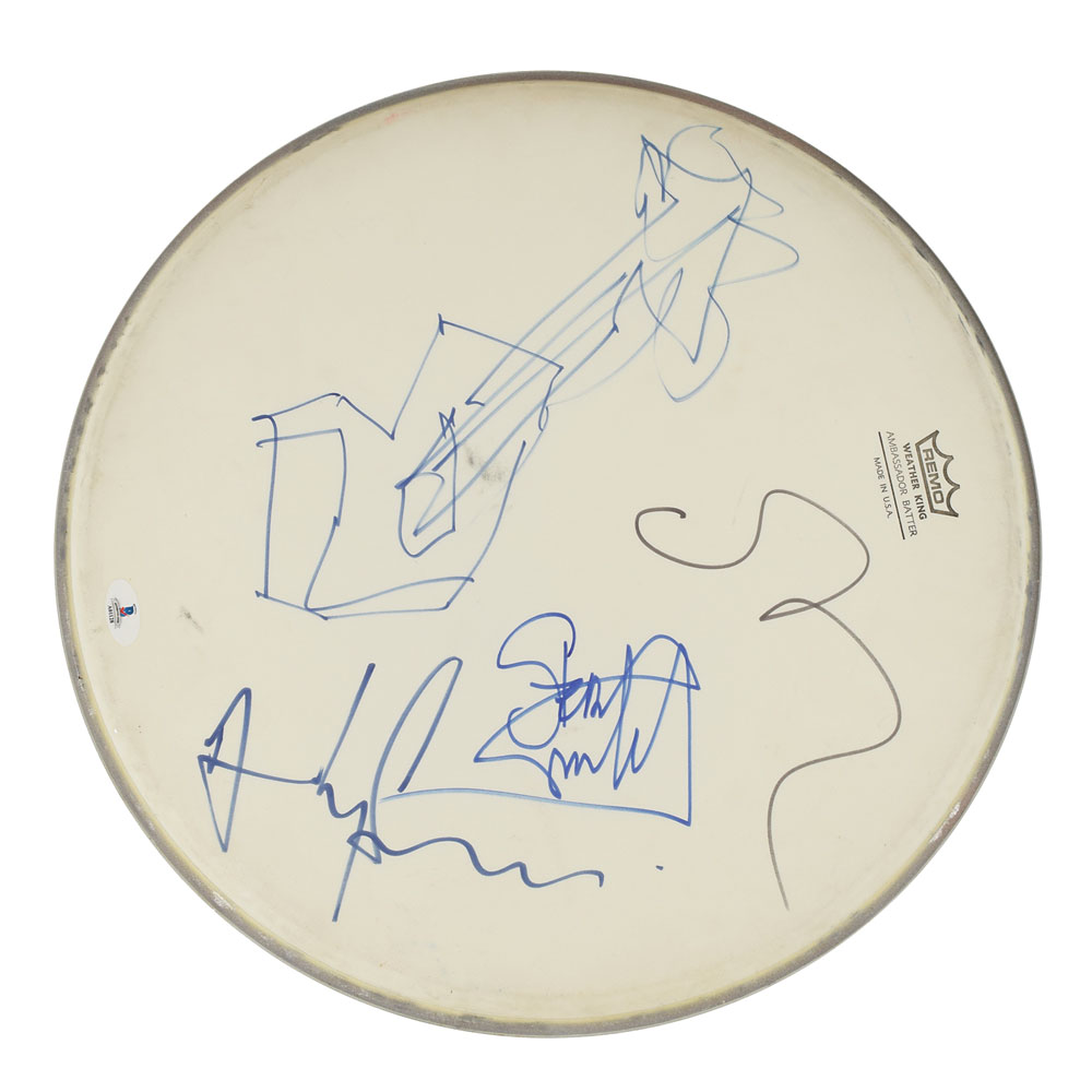 Superb white coated 14.5″ drum head by Remo, signed in felt tip by Sting, Stewart Copeland, and Andy Summers. Summers fills the empty space with a huge abstract sketch of a guitar. In fine condition, with light soiling to the perimeter and a Beckett authentication label affixed at the bottom. A wonderful piece signed by the legendary British rock trio. From The John Brennan In-person Autograph Collection.