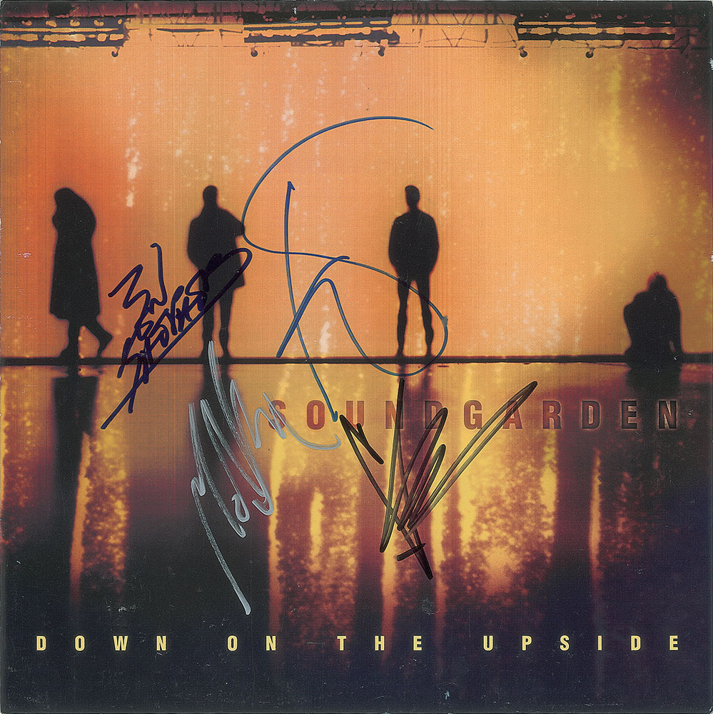 Down on the Upside album flat signed on the front in black felt tip by Chris Cornell, in blue felt tip by Kim Thayil and Ben Shepherd, and in silver ink by Matt Cameron. In fine condition.