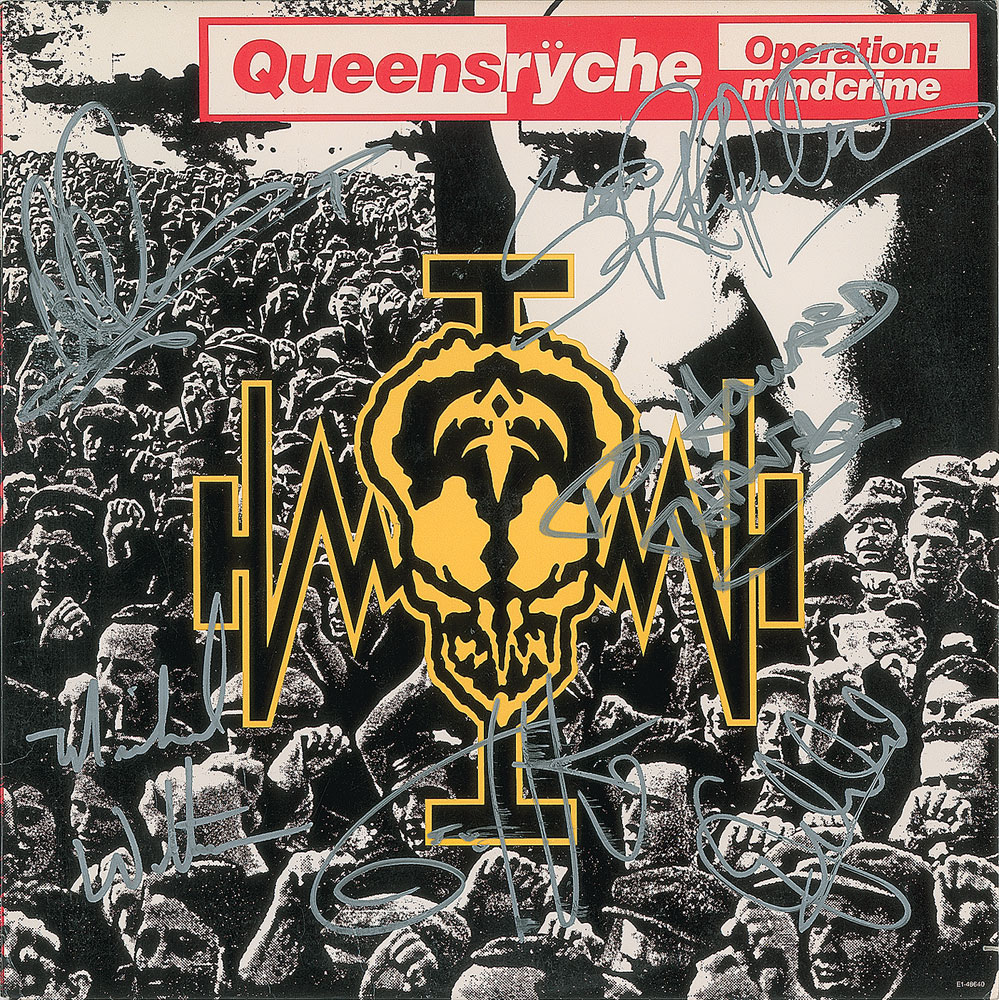 Operation: Mindcrime album signed on the front cover in silver ink by Geoff Tate, Chris DeGarmo, Michael Wilton, Eddie Jackson, and Scott Rockenfield, with one adding an inscription to "Howard." In fine condition. The record is included. From The John Brennan In-person Autograph Collection.
