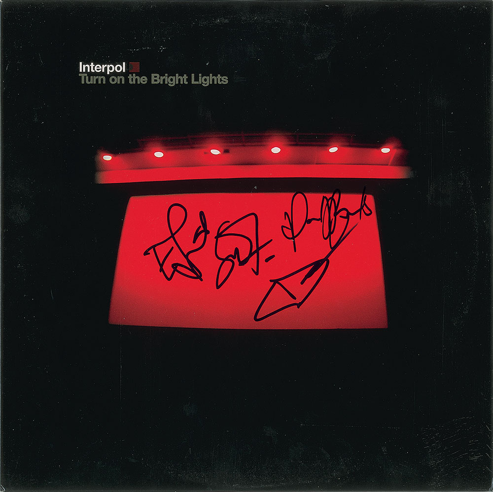 Turn on the Bright Lights album signed on the front cover in blue felt tip by Paul Banks, Carlos D, Samuel Fogarino, and one other. In fine condition. The record is included. From The John Brennan In-person Autograph Collection.