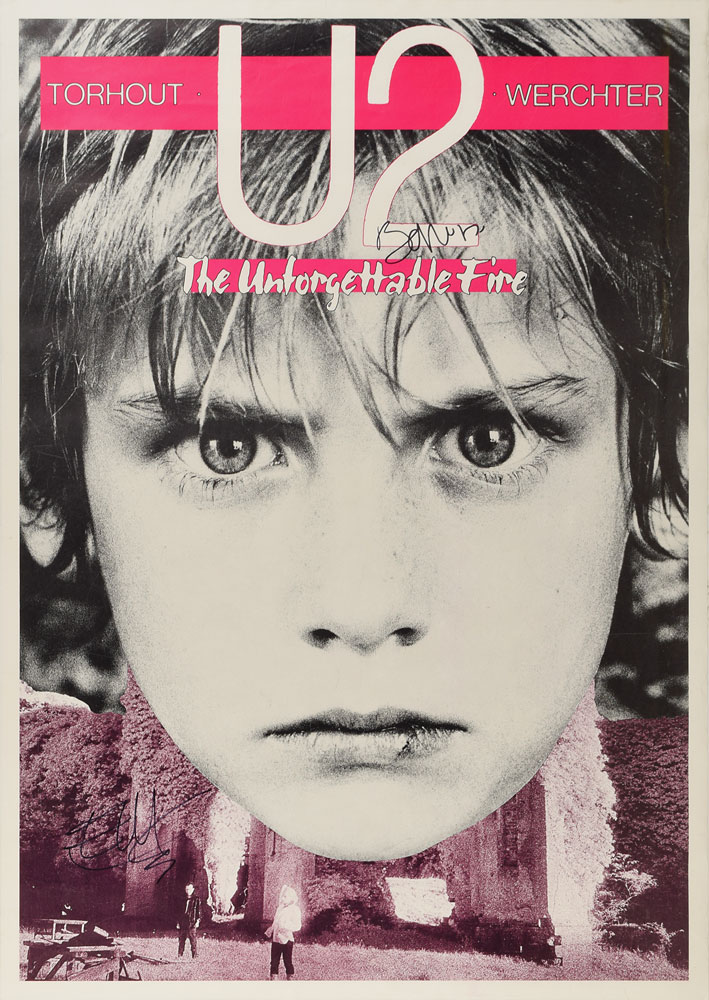 Scarce color 24 x 34 poster for U2's appearance at Belgium's Torhout Festival in July 1985, as part of The Unforgettable Fire tour, signed in black felt tip, "Bono, '12" and "Edge." Rolled and in fine condition.