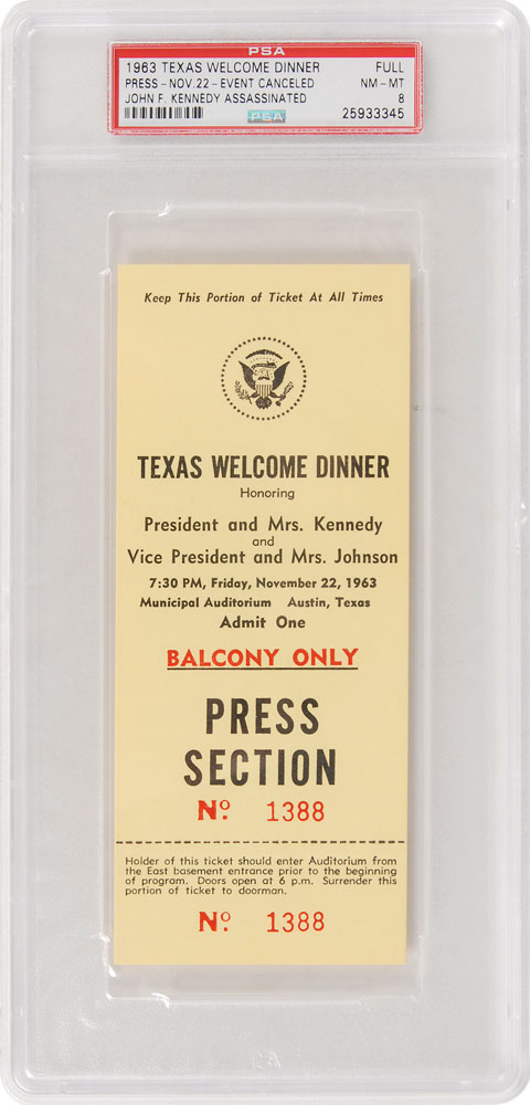 Unused original "Press Section, Balcony Only" ticket, number 1388, 2.5 x 6, to the 'Texas Welcome Dinner' presented in honor of President John F. Kennedy and Vice President Lyndon B. Johnson, to be held at the Municipal Auditorium in Austin at 7:30 PM on November 22, 1963. Encapsulated in a plastic PSA/DNA authentication and grading holder, evaluating the ticket as "NM-MT 8." In fine condition. Scheduled to occur on the night of Kennedy's assassination, this dinner would never take place.