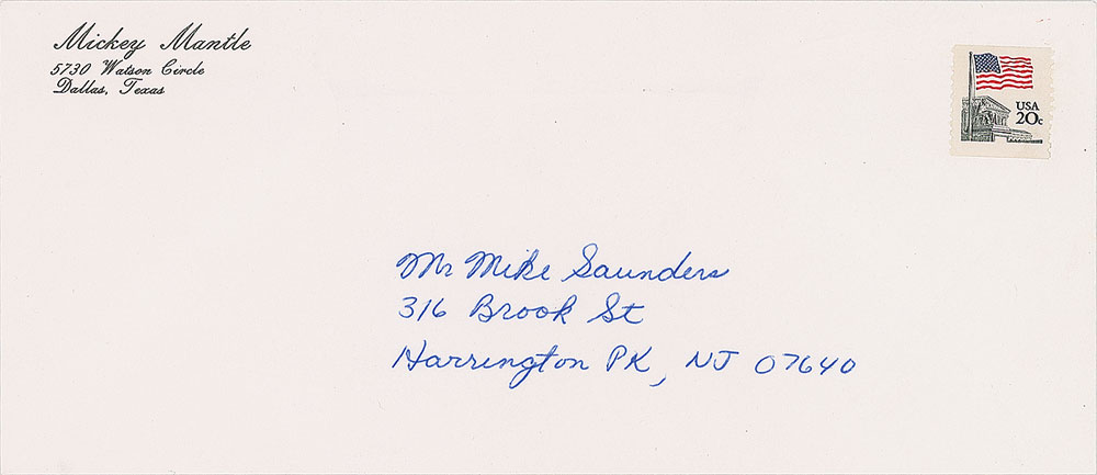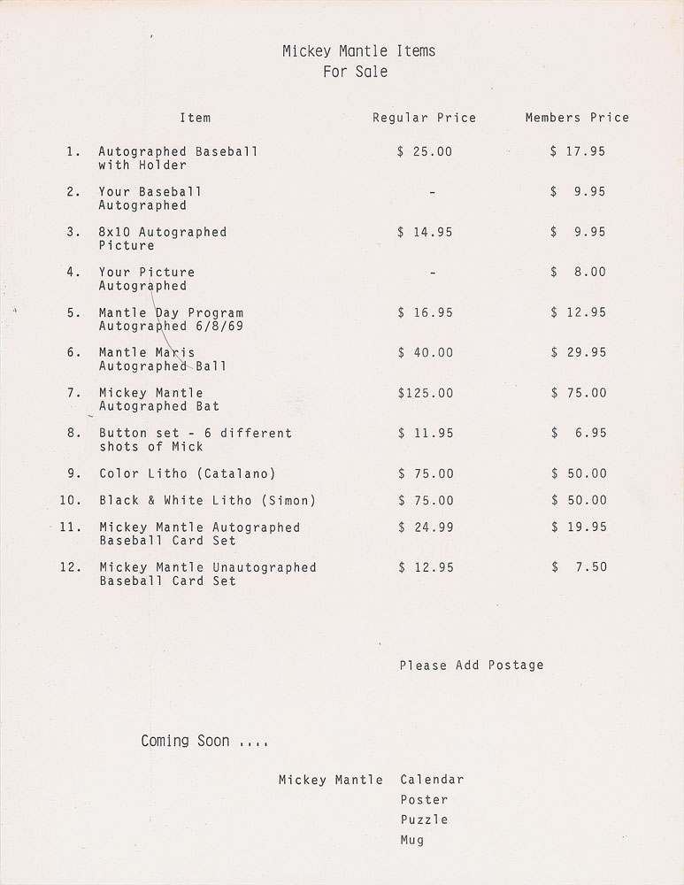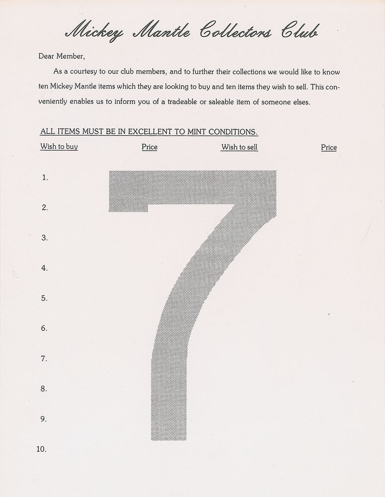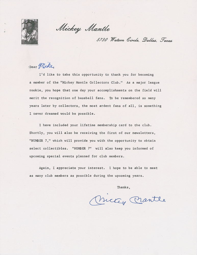 TLS, one page, 8.5 x 11, personal letterhead, no date but circa 1984-1985. Letter to "Mike," in part: "I'd like to take this opportunity to thank you for becoming a member of the 'Mickey Mantle Collectors Club.' As a major league rookie, you hope that one day your accomplishments on the field will merit the recognition of baseball fans. To be remembered so many years later by collectors, the most ardent fans of all, is something I never dreamed would be possible." In fine condition. Accompanied by an unpostmarked mailing envelope, Mickey Mantle Collectors Club order form and price list, and membership card.