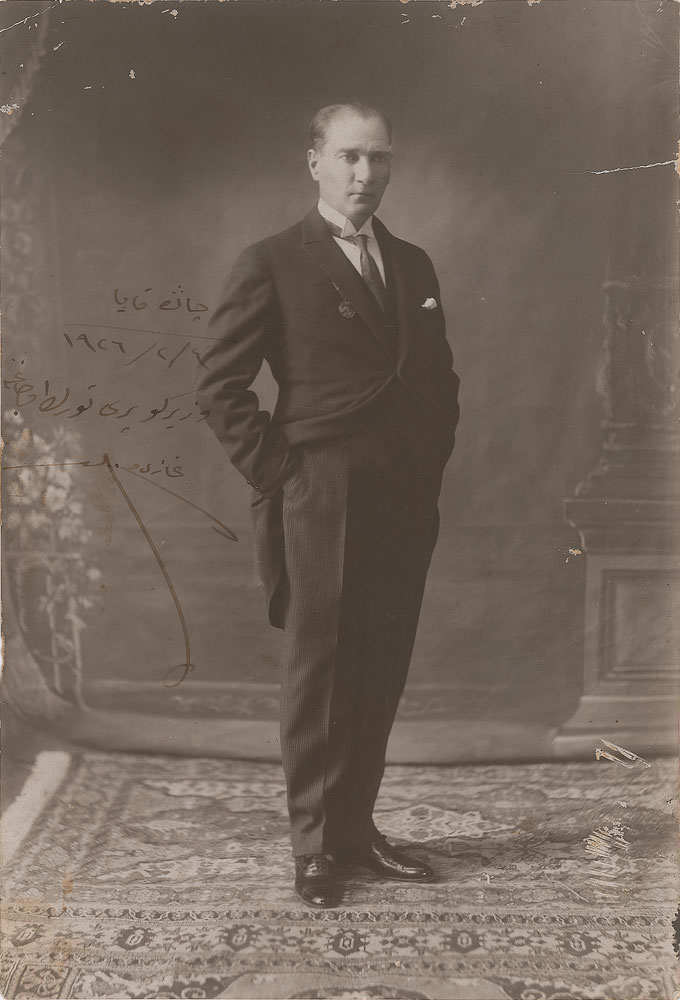 Turkish army officer, statesman, and writer (1881-1938) credited as the founder of the Republic of Turkey. Exceptional matte-finish 5.75 x 8.5 full-length portrait of Ataturk in formal attire, signed and inscribed in ink to the Gankaya Vezirkopru Turkish Power Society. In very good to fine condition, with trimmed edges, some scratching and flecks of missing emulsion, and a tear to the upper right edge. A highly appealing inscribed photograph of the heroic Turkish reformer, whose autograph remains rare across all formats.
