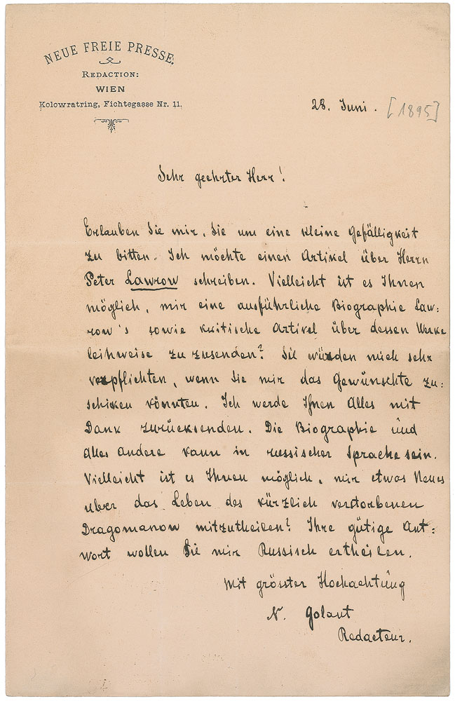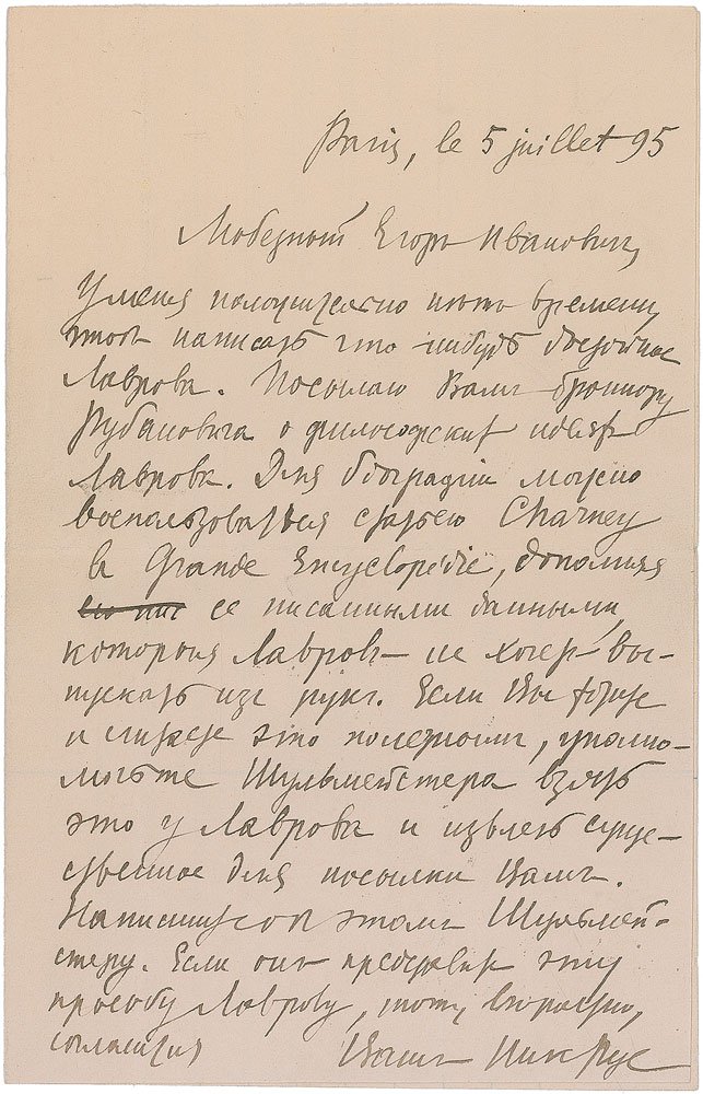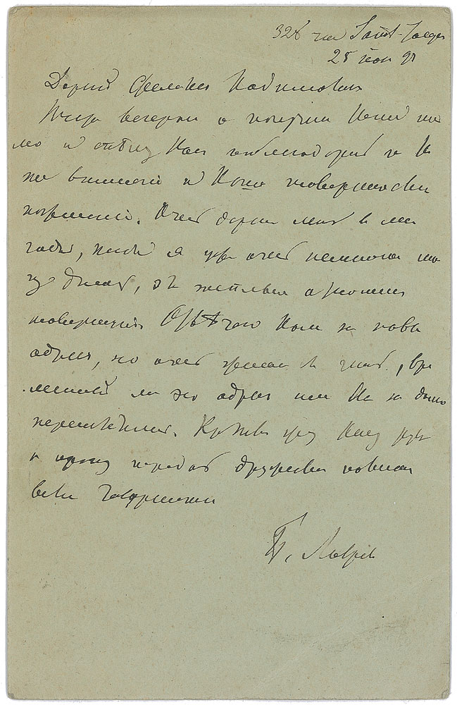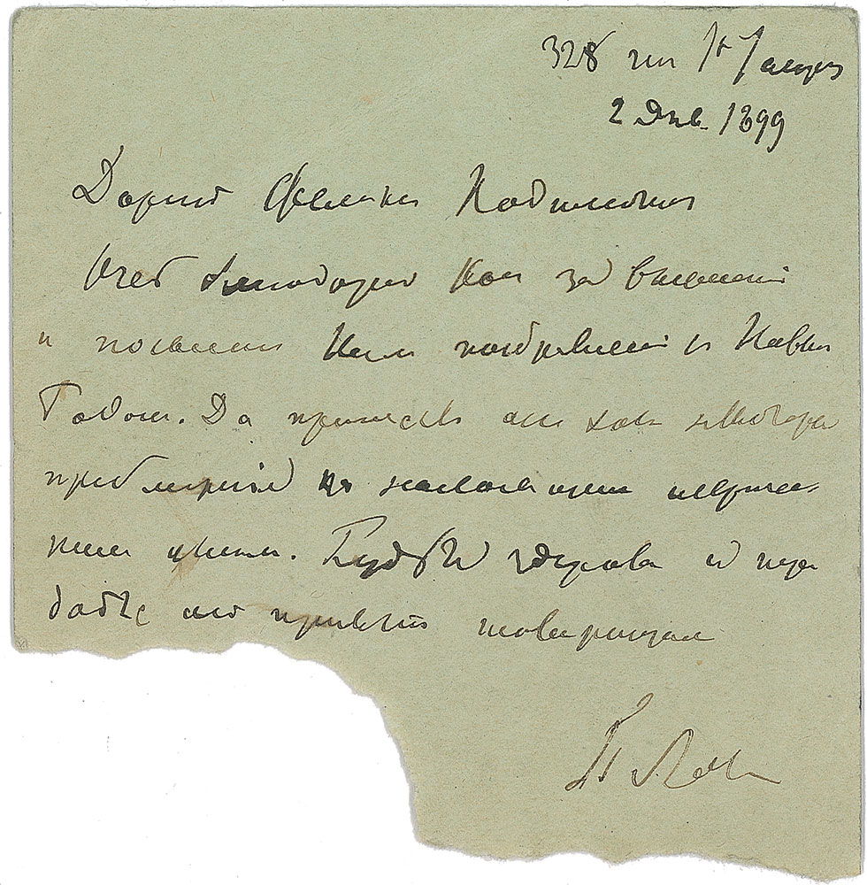 Prominent Russian theorist of narodism, philosopher, publicist, and sociologist (1823-1900) who endorsed revolutionary socialist ideals. Two ALSs in Cyrillic, signed "P. Lavrov," each one page on a postcard, one 3.5 x 5.5 and the other torn to 3.5 x 3.5, dated 1897 and 1899. Both untranslated and sent to the Russian revolutionary, journalist, and writer Felix Volkhovsky. Aforementioned tear to one postcard, and scattered creases, otherwise fine condition. Accompanied by an unsigned photo of Lavrov on his deathbed, a letter by journalist Nathan Golant, and one additional contemporary letter.