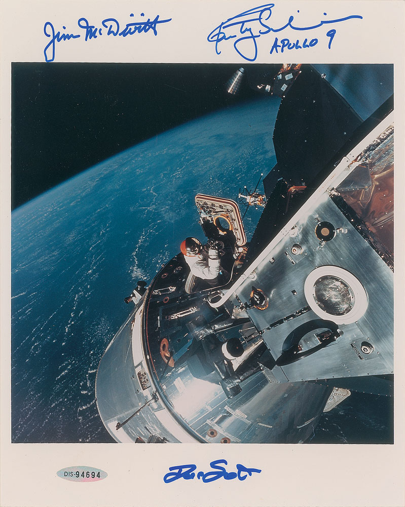 Color semi-glossy 8 x 10 photo of Dave Scott exiting the hatch of the command module Gumdrop during the Apollo 9 mission, signed in the borders in blue felt tip, "Jim McDivitt," "Rusty Schweickart, Apollo 9," and "Dave Scott." In fine condition, with two small light surface impressions.