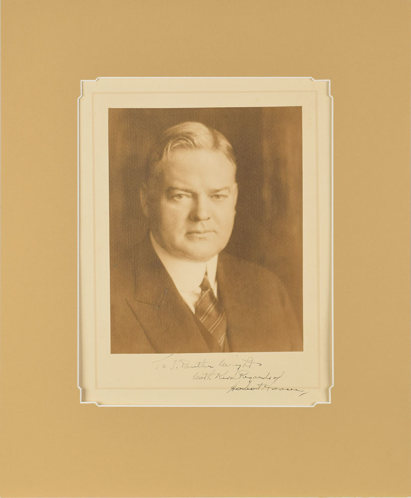 Handsome matte-finish 9.75 x 12.5 portrait of the 31st American president, signed and inscribed in fountain pen, "To J. Butler Wright, with kind regards of, Herbert Hoover.” Matted to an overall size of 15.75 x 19. In fine condition. Wright was a United States diplomat who served as the twentieth and last Third Assistant Secretary of State. President Hoover appointed Wright as Envoy to Uruguay in 1930.