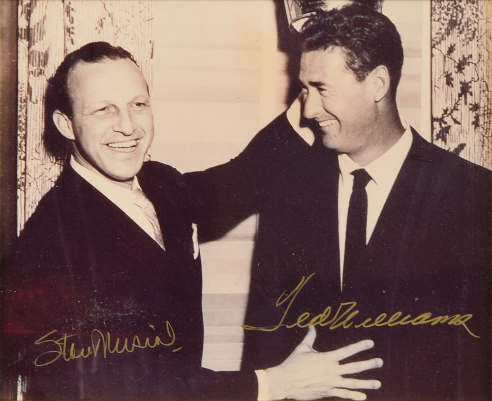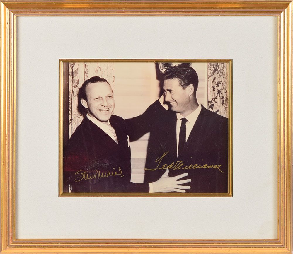 Glossy 9.75 x 8 half-length photo of Stan Musial and Ted Williams chumming it up at a formal event, signed in gold ink by both legendary ballplayers. Matted and framed to an overall size of 17.5 x 15.5. In fine condition.