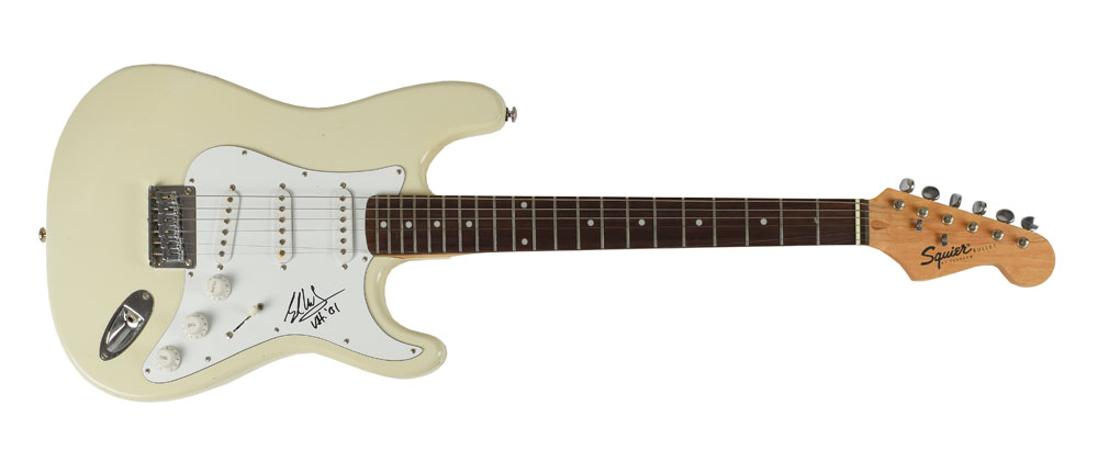 Cream-bodied Fender Squier Bullet Stratocaster electric guitar, signed on the white pickguard in black felt tip by Eddie Van Halen, who adds, "VH, '01." In fine condition, with some light wear to the body. Originally obtained by in-person specialist Mike Wehrmann.