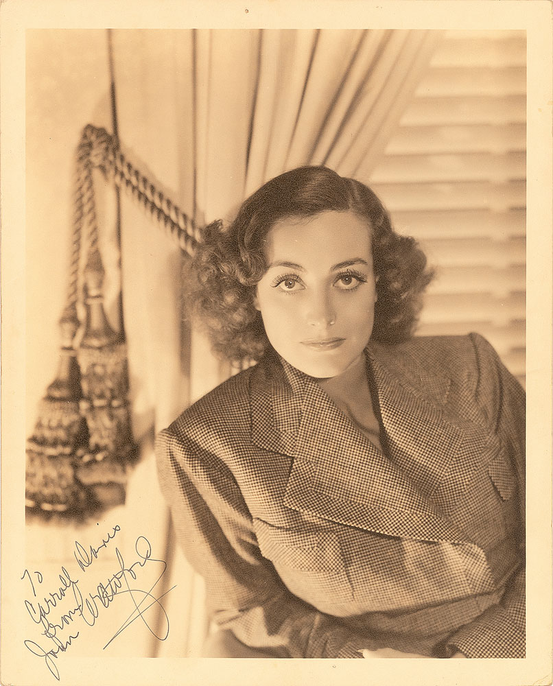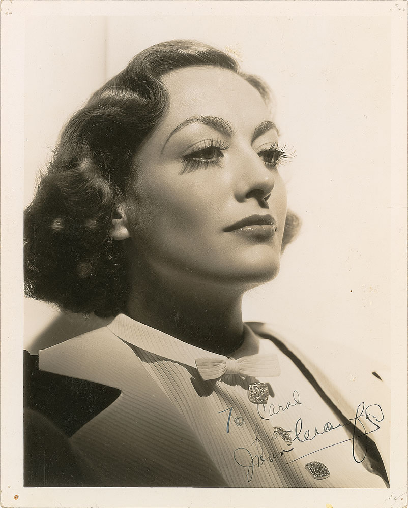 Three photos signed by Joan Crawford, including: a stunning vintage pearl-finish 8 x 10 photo of Crawford by George Hurrell, signed and inscribed in fountain pen, "To Carol, from Joan Crawford," with the reverse bearing a Hurrell/MGM credit stamp; a matte-finish 8 x 10 photo of Crawford staring directly into the camera, signed and inscribed in black ink, "To Carroll Davis, from, Joan Crawford"; and a vintage matte-finish 8 x 10 seated portrait of Crawford by famed MGM photographer Laszlo Willinger, signed and inscribed in fountain pen, "To Carol Davis, from, Joan Crawford," with the reverse bearing an MGM-Willinger credit stamp. In overall fine condition, with pin and tack holes to corners and a few small creases.