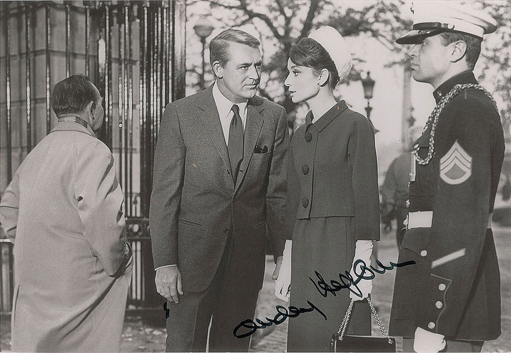 Glossy 8.25 x 5.75 photo of Audrey Hepburn with Cary Grant in the 1963 film Charade, signed in black felt tip by Hepburn. Reverse bears German caption text. In fine condition.