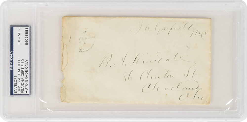 Free franked mailing envelope, 5.75 x 3.25, addressed by Garfield to "B. A. Hinsdale, 86 Clinton St., Cleveland, Ohio," and franked in the upper right, "J. A. Garfield, MC." Encapsulated in a plastic PSA/DNA authentication and grading holder, evaluating the autograph as "EX-MT 6." In very good to fine condition, with overall soiling, a torn left edge from opening, and notations on the reverse in an unknown hand.