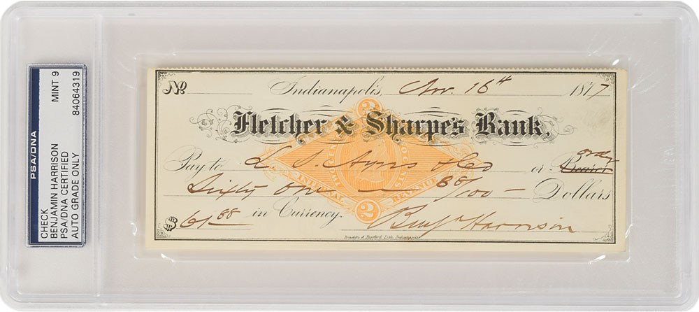 Fletcher & Sharpe's Bank check, 6.5 x 2.75, filled out and signed by Harrison, "Benj. Harrison," payable to L. S. Ayres & Co. for $61.88, November 16, 1877. Encapsulated in a plastic PSA/DNA authentication and grading holder, evaluating the autograph as "Mint 9." In fine condition.