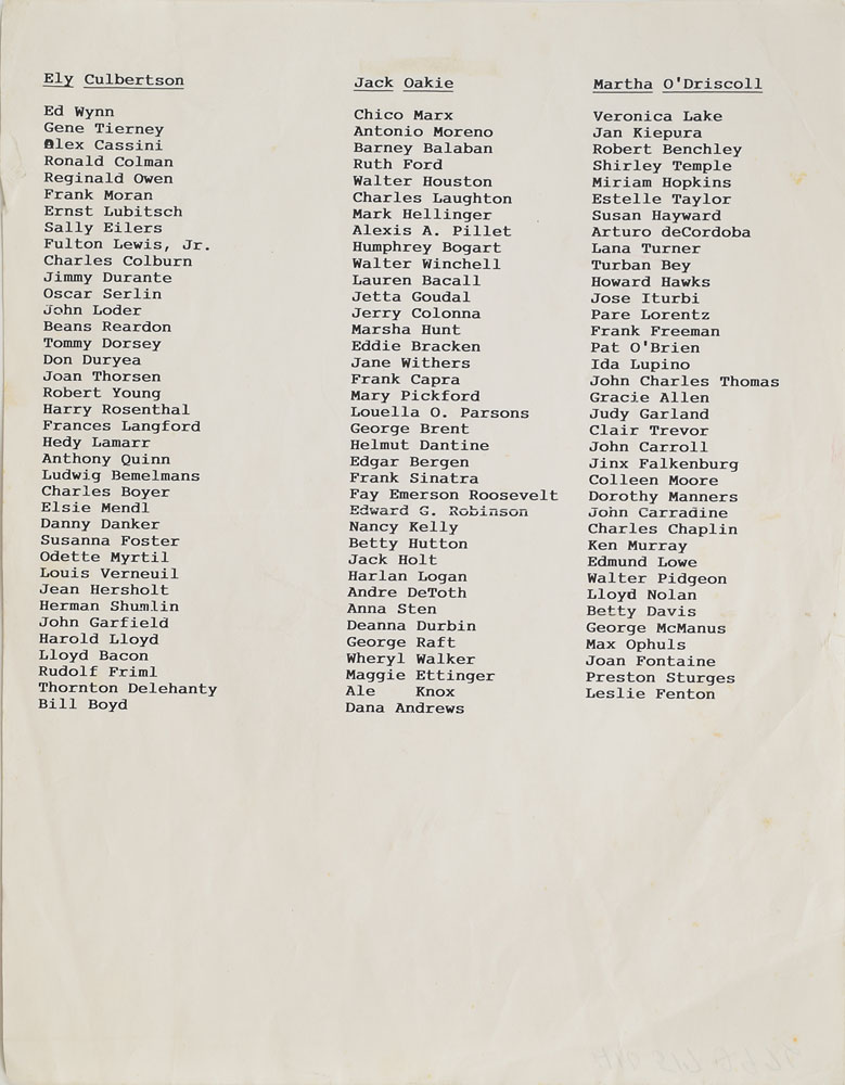 Humphrey Bogart, Lauren Bacall, Charlie Chaplin, Judy Garland, Frank Sinatra, Chico Marx, Harold Lloyd, Veronica Lake, Shirley Temple, Gene Tierney, Edward G. Robinson, Bette Davis, Frank Capra, Jimmy Durante, Hedy Lamarr, Anthony Quinn, John Garfield, Tommy Dorsey, Dana Andrews, Walter Houston, Charles Laughton, Lana Turner, Ronald Colman, Howard Hawks, Mary Pickford, Reginald Owen, John Carradine, Robert Young, Pat O’Brien, Ida Lupino, George McManus (who adds a sketch of Jiggs), Ernst Lubitsch, Walter Pidgeon, Joan Fontaine, Susan Hayward, Betty Hutton, Gracie Allen, Nancy Kelly, Jack Holt, Harlen Logan, Andre DeToth, Anna Sten, Deanna Durbin, George Raft, Wheryl Walker, Maggie Ettinger, Ale Know, Martha O’Driscoll, Ely Culbertson, Ed Wynn, Louella Parsons, Alex Cassini, Frank Moran, Sally Eilers, Futon Lewis, Charles Coburn, Oscar Serlin, John Loder, Beans Reardon, Don Duryea, Joan Thorsen, Harry Rosenthal, Frances Langford, Ludwig Bemelmans, Charles Boyer, Danny Danker, Susanna Foster, Odette Myrtil, Louis Verneuil, Jean Hersholt, Herman Shumlin, Jane Withers, Lloyd Bacon, Rudolf Friml, Thornton Delehanty, Bill Boyd, Jackie Oakie, Antonio Moreno, Barney Balaban, Ruth Ford, Jan Kiepura, Robert Benchley, Miriam Hopkins, Estelle Taylor, Arturo de Cordova, Turban Bey, Jose Iturbi, Pare Lorentz, Frank Freeman, John Charles Thomas, Clair Trevor, John Carroll, Jinx Falkenburg, Colleen Moore, Dorothy Manners, Ken Muray, Edmund Lowe, Lloyd Nolan, Max Ophuls, Leslie Fenton, and, of course, Sturges himself. Framed to an overall size of 20.75 x 10.75. In fine condition.