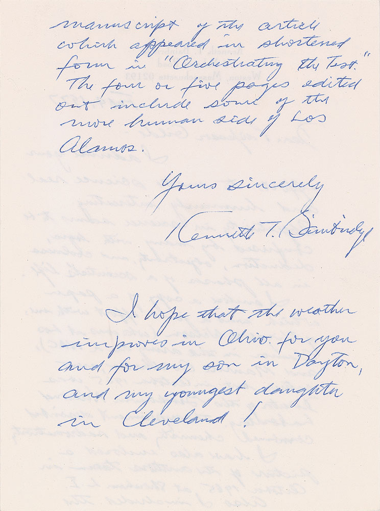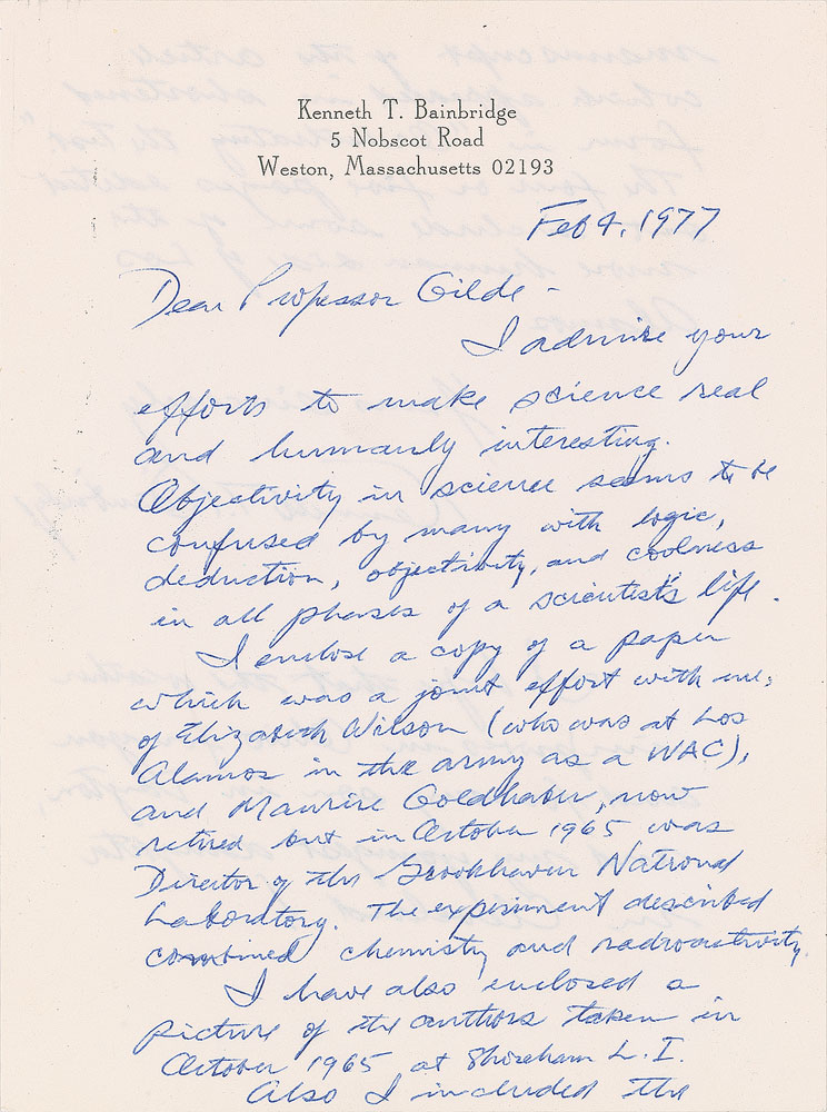 American physicist (1904-1996) at Harvard University who did work on cyclotron research and was director of the Manhattan Project's Trinity nuclear test. ALS, one page both sides, 5.75 x 7.75, personal letterhead, February 4, 1977. Letter to "Professor Gilde," in part: "I admire your efforts to make science real and humanly interesting. Objectivity in science seems to be confused by many with logic, deduction, objectivity, and coolness in all phases of a scientist's life. I enclose a copy of a paper which was a joint effort with me, of Elizabeth Wilson (who was at Los Alamos in the army as a WAC), and Maurice Goldhaber, now retired but in 1965 was Director of the Brookhaven National Laboratory. The experiment described combined chemistry and radioactivity." In fine condition.