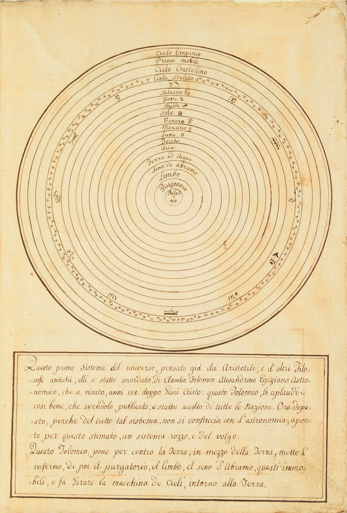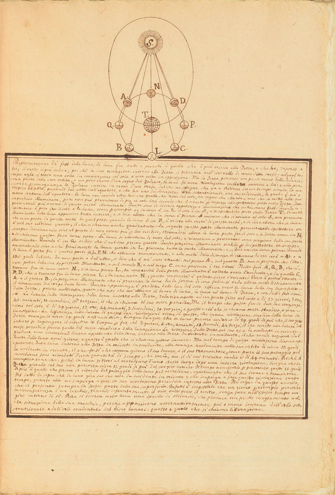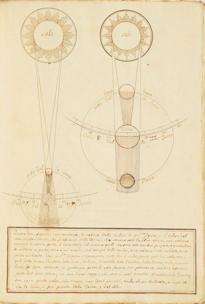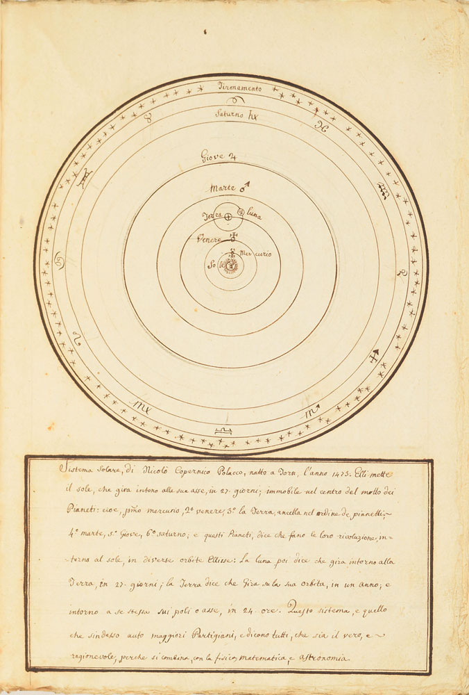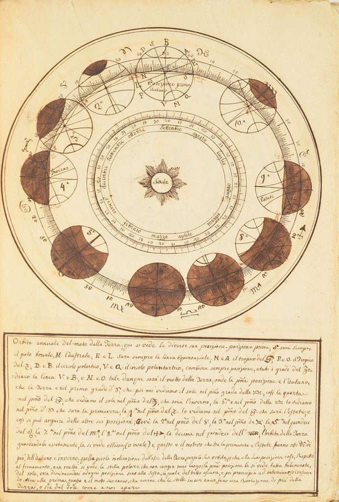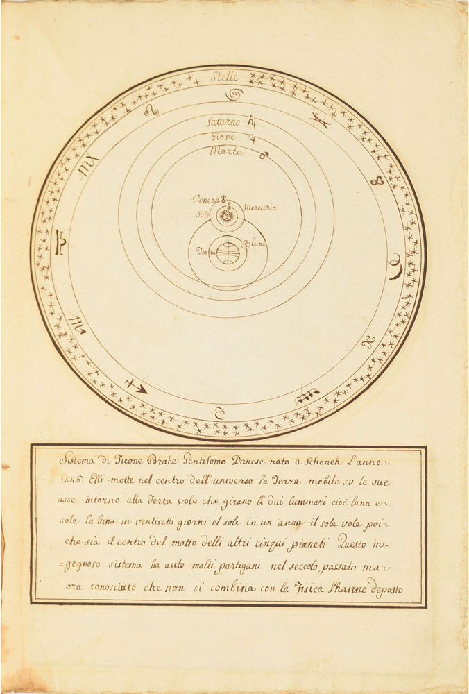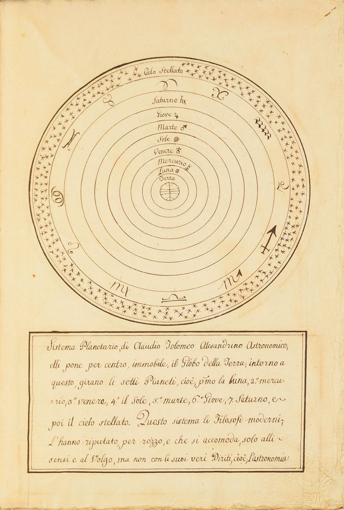 Extraordinary handwritten astronomical manuscript in Italian, 79 leaves (all with diagrams), 7.5 x 10.75, with spine label annotated, "Sul Mondo di Baldassare Valaputi." The impressive manuscript opens with a diagram of the "sistema del universo, pensato gia da Aristotile"—the model of the universe conceived by Aristotle. This is followed by a diagrams of the planetary systems developed by "Claudio Tolomeo," Ptolemy; "Nicolas Copernico Polaco," Nicolaus Copernicus; and "Ticone Brahe," Tycho Brahe. Further notable pages include diagrams of Earth's orbit of the sun, maps of the moon, diagrams of eclipses, depictions of the planets, maps, and more. The manuscript has been stab-bound in hardcover boards, and includes a custom-made slipcase. Book condition: VG/None, with general wear and some dampstaining to boards. A remarkable, exceptionally highly detailed manuscript that chronicles man's knowledge of the universe through the ages.
