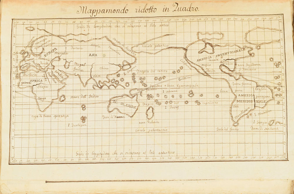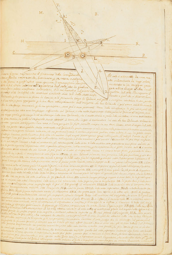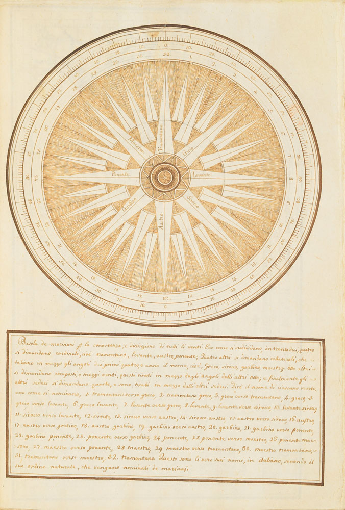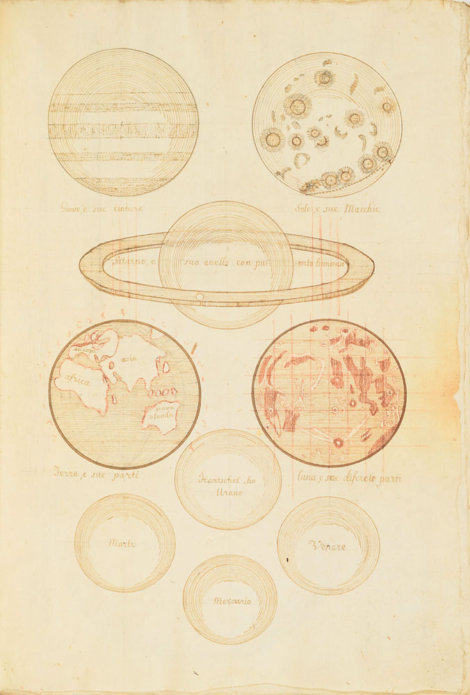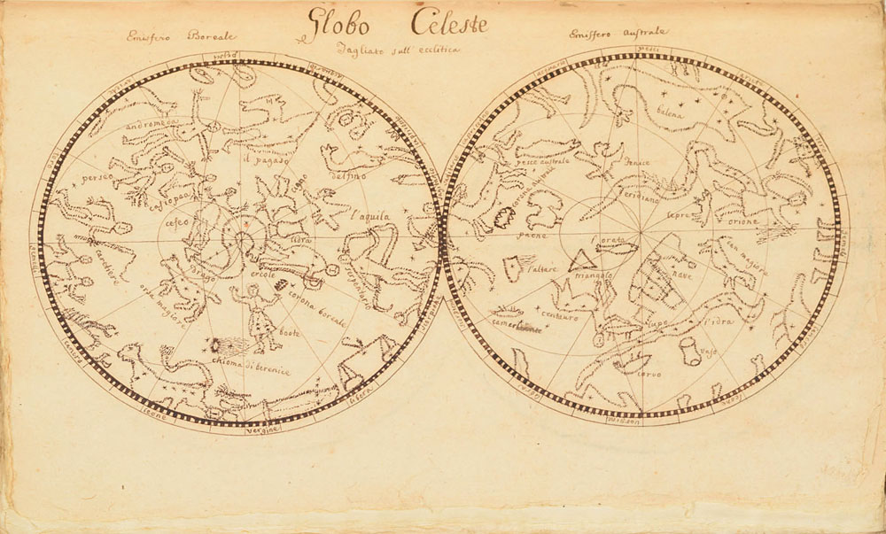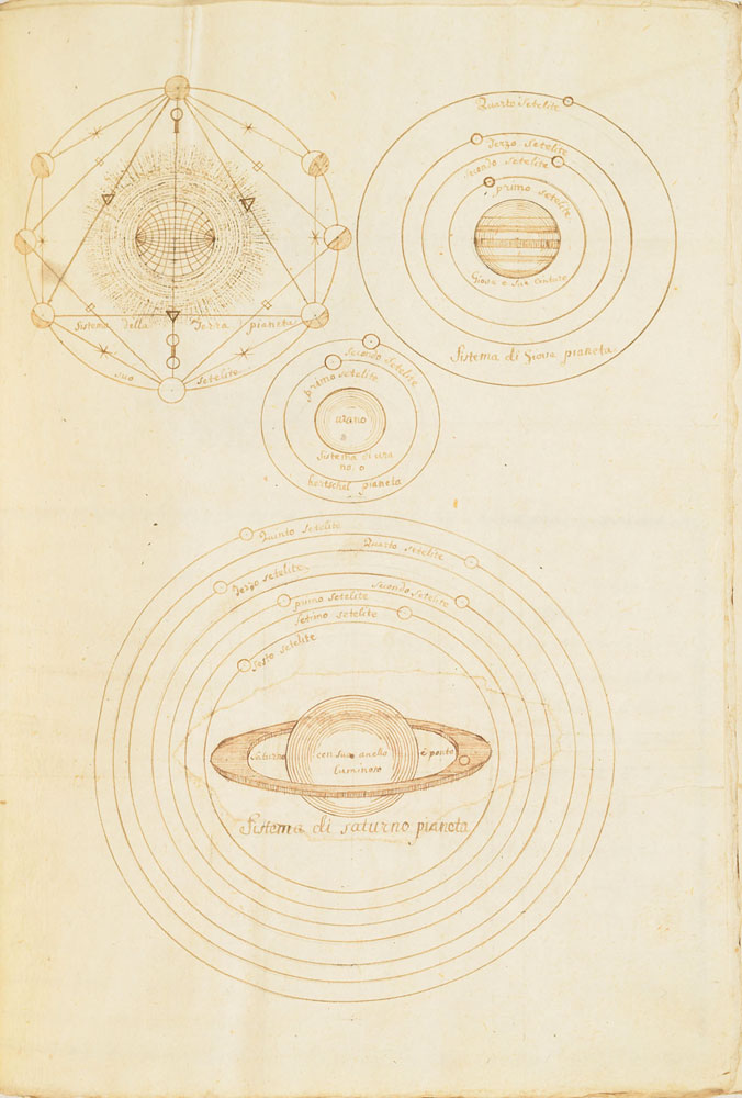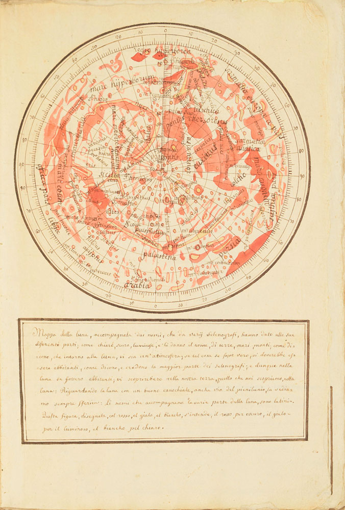 Extraordinary handwritten astronomical manuscript in Italian, 79 leaves (all with diagrams), 7.5 x 10.75, with spine label annotated, "Sul Mondo di Baldassare Valaputi." The impressive manuscript opens with a diagram of the "sistema del universo, pensato gia da Aristotile"—the model of the universe conceived by Aristotle. This is followed by a diagrams of the planetary systems developed by "Claudio Tolomeo," Ptolemy; "Nicolas Copernico Polaco," Nicolaus Copernicus; and "Ticone Brahe," Tycho Brahe. Further notable pages include diagrams of Earth's orbit of the sun, maps of the moon, diagrams of eclipses, depictions of the planets, maps, and more. The manuscript has been stab-bound in hardcover boards, and includes a custom-made slipcase. Book condition: VG/None, with general wear and some dampstaining to boards. A remarkable, exceptionally highly detailed manuscript that chronicles man's knowledge of the universe through the ages.