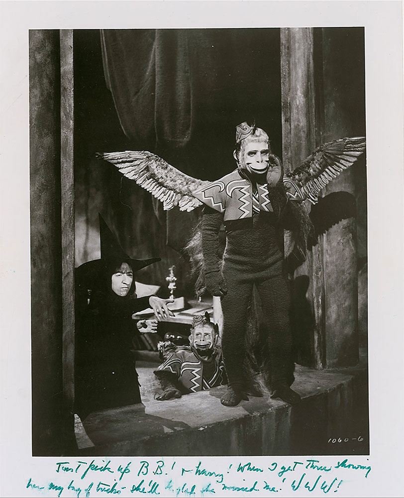 Glossy 8 x 10 photo of the Wicked Witch of the West scheming alongside her flying monkeys in the 1939 classic The Wizard of Oz, signed and inscribed with her character's name in the lower border in green felt tip, “Just pick up B.B.! & hurry! When I get thru showing her my bag of tricks—she’ll be glad she missed me! WWW!” In very good condition, with some surface impressions and smearing of a few words from Hamilton touching the still-wet ink. Accompanied by two unsigned photos from the movie.