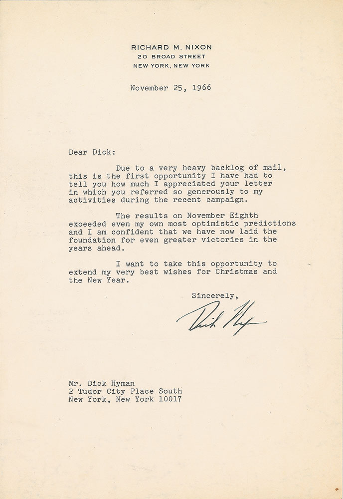 TLS, one page, 7.25 x 10.5, personal letterhead, November 25, 1966. Letter to Dick Hyman, in part: "Due to a very heavy backlog of mail, this is the first opportunity I have had to tell you how much I appreciated your letter in which you referred so generously to my activities during the recent campaign. The results on November Eighth exceeded even my own most optimistic predictions and I am confident that we have now laid the foundation for even greater victories in the years ahead. I want to take this opportunity to extend my best wishes for Christmas and the New Year." In fine condition.