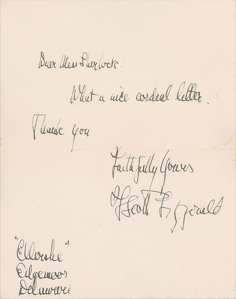 ANS, one page, 5 x 6.5, no date but circa late 1920s. Beautifully penned note from Fitzgerald, in full: "Dear Miss Sherlock, What a nice cordial letter. Thank you. Faithfully yours, F. Scott Fitzgerald, 'Ellerslie,' Edgemoor, Delaware." In fine condition, with trimmed edges and a horizontal fold. In March 1927, F. Scott Fitzgerald and his wife Zelda moved into 'Ellerslie,' a mansion located on the Delaware River, where they stayed until 1929. There they hosted many of the lavish 'Roaring '20s' parties that have come to characterize Fitzgerald's work, and they welcomed celebrity guests including Ernest Hemingway. A superb autograph from the height of Fitzgerald's career.