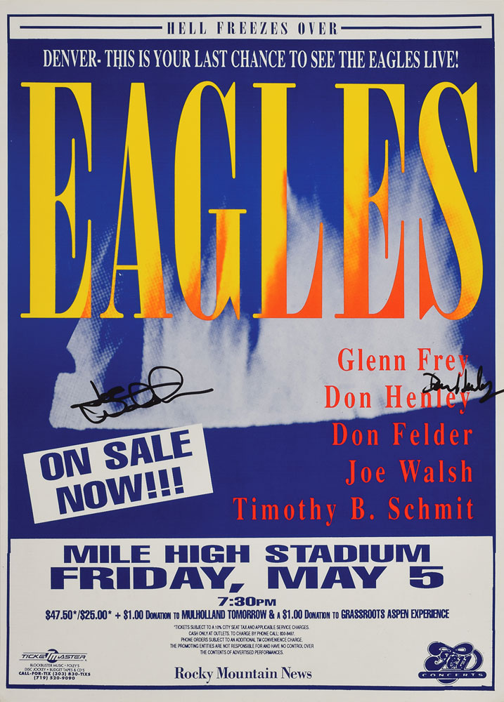Original color 13 x 17.5 first printing poster for an Eagles concert at Mile High Stadium in Denver, Colorado, on May 5, 1995, as part of the Hell Freezes Over Tour, signed in black felt tip by Joe Walsh and Don Henley. In fine condition.
