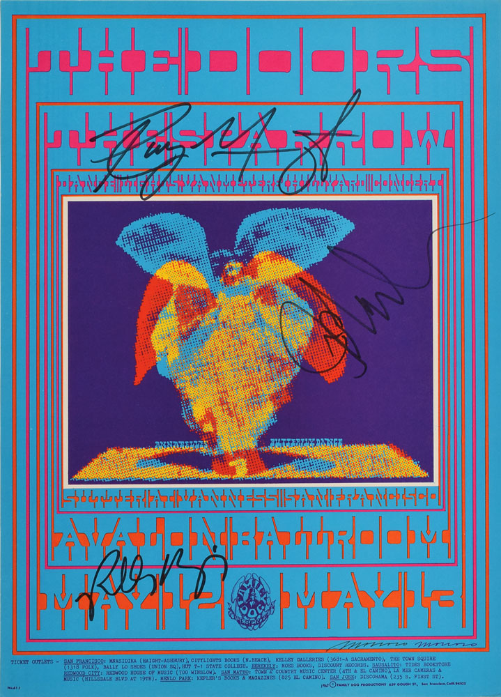 Original color 14 x 20 third printing poster for The Doors at the Avalon Ballroom on May 12, 1967, signed in black felt tip by Ray Manzarek and Robby Krieger. Also signed in black felt tip by the poster's artist, Victor Moscoso. In fine condition.