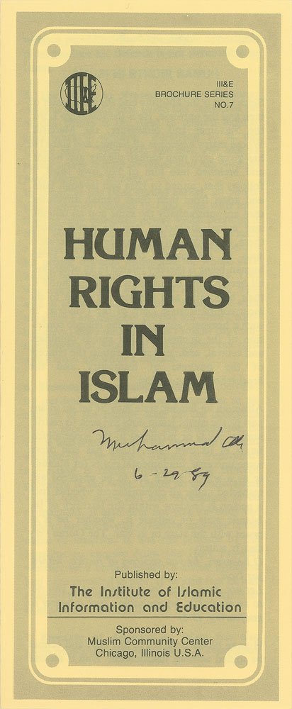 Tri-fold religious pamphlet entitled "Human Rights in Islam," 3.5 x 8.5, signed on the front in black ballpoint, "Muhammad Ali, 6-29-89." In very fine condition.