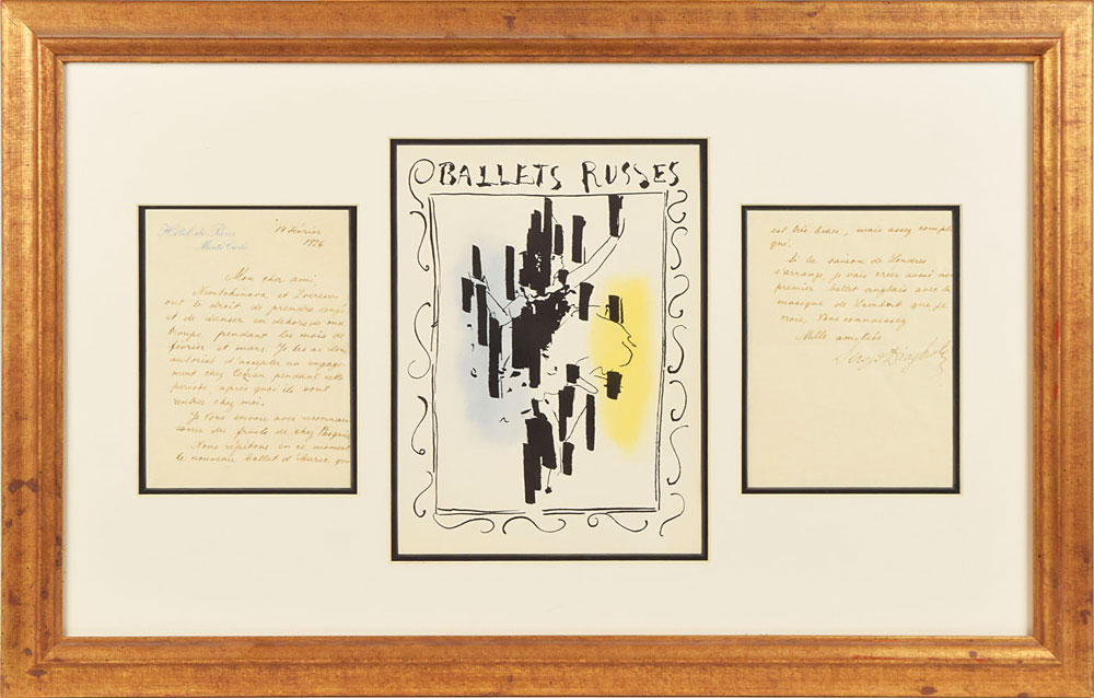 LS in French, two pages, 5 x 7, Hotel de Paris letterhead, February 14, 1926. Letter to ballet critic Edwin Evans, in full: "Nemtchinova and Zverev have permission to dance outside my troupe during the months of February and March. I have also allowed them to accept an engagement with Cochran during this period, after which they will return to me. I send you with gratitude the fruits of Pasquier's troupe. Currently we are showing the new ballet of Auric [Pastorale] which is very beautiful, but quite complicated. If we can arrange the London season, I am going to create my first English ballet with music of Lambert, which I think you know." Impressively double-matted and framed with a colorful Ballets Russes program cover to an overall size of 27 x 17.25. In fine condition.