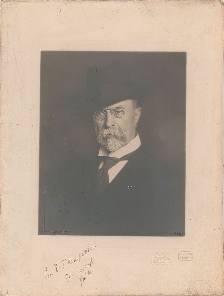 Founder and first President of Czechoslovakia (1850-1937). Vintage matte-finish 9.5 x 12.5 studio portrait of Masaryk by J. F. Langhans, signed and inscribed in Czech in fountain pen, "T. G. Masaryk, 3/VII '20." Lower right bears the studio blindstamp. In very good to fine condition, with some scratching to the image and mount, and trimming, soiling, and short edge tears to the mount.
