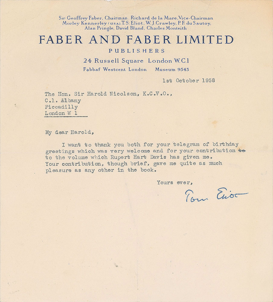 TLS signed “Tom Eliot,” one page, 7 x 8, Faber and Faber Limited letterhead, October 1, 1958. Letter to Harold Nicolson, in full: "I want to thank you both for your telegram of birthday greetings which was very welcome and for your contribution to the volume which Rupert Hart Davis has given me. Your contribution, though brief, gave me quite as much pleasure as any other in the book." In very good to fine condition, with creasing to the top. Eliot's last original play, The Elder Statesman, made its debut in 1958.