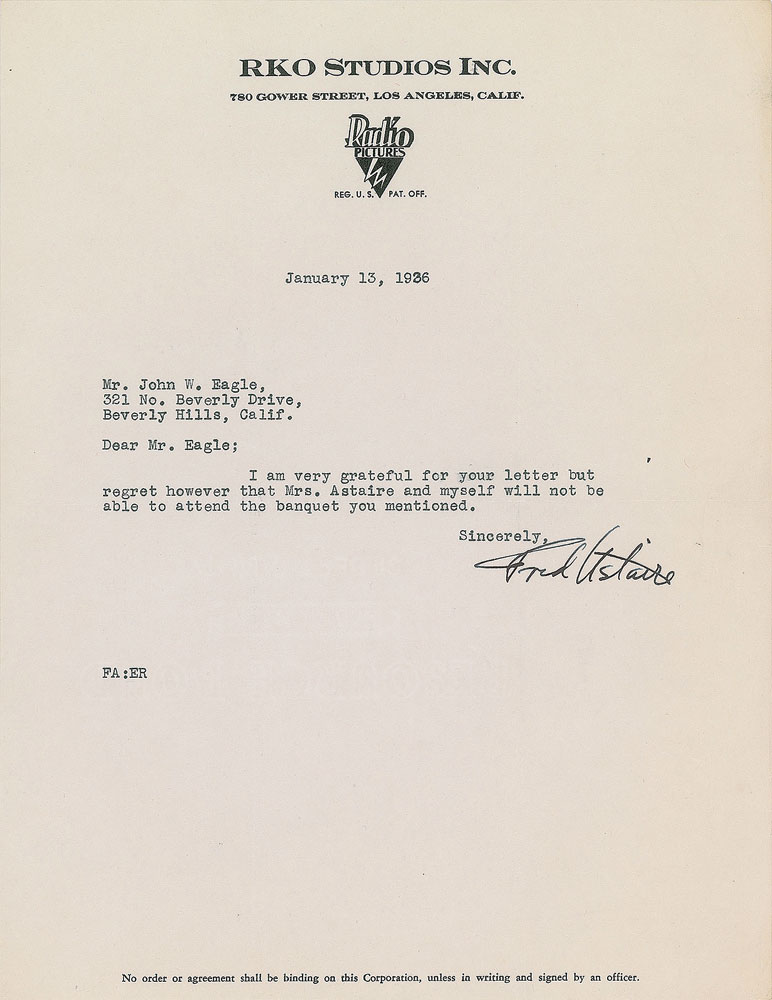 TLS, one page, 8.5 x 11, RKO Studios Inc. letterhead, January 13, 1936. Brief letter to John Eagle, in full: "I am very grateful for your letter but regret however that Mrs. Astaire and myself will not be able to attend the banquet you mentioned." In fine condition.