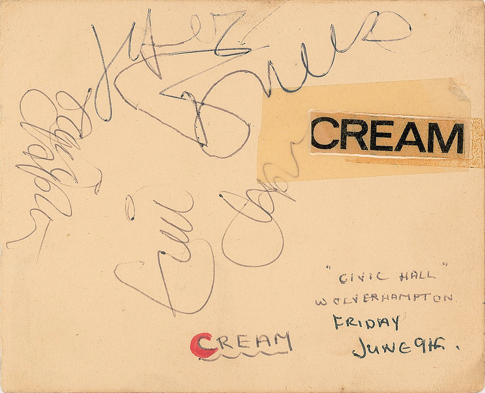 Vintage ballpoint signatures of Jack Bruce and Eric Clapton, who signs twice, on an off-white 5 x 4 album page. Collector's notations indicate the signatures were obtained at the Civic Hall in Wolverhampton on June 9, [1967]. In very good to fine condition, with old tape touching one of the Clapton signatures, and just impinging on Bruce.