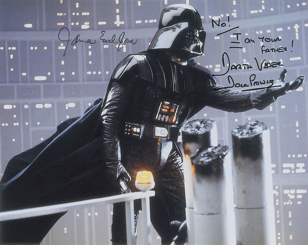 Color satin-finish 10 x 8 photo of Darth Vader offering his hand after a Cloud City battle with Luke Skywalker in the 1980 science fiction epic The Empire Strikes Back, signed in black felt tip, "James Earl Jones" and "No! I am your father! Darth Vader, Dave Prowse." In fine condition.