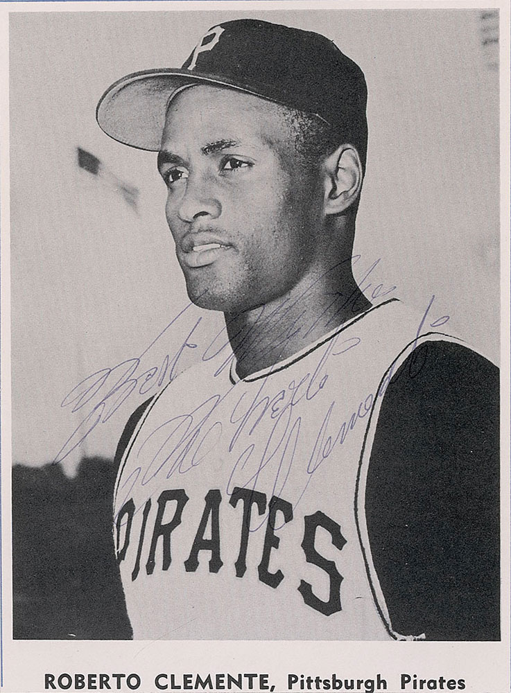 Vintage 1958-61 Jay Publishing team issued photo of Clemente, 4.5 x 6.5, signed in blue ballpoint, "Best Wishes, Roberto Clemente." In fine condition, with lightly trimmed edges. Clemente's signature is often rushed and illegible, but this photo of Clemente in his prime offers a clean, attractive example. A great piece from the humanitarian and Hall of Famer.