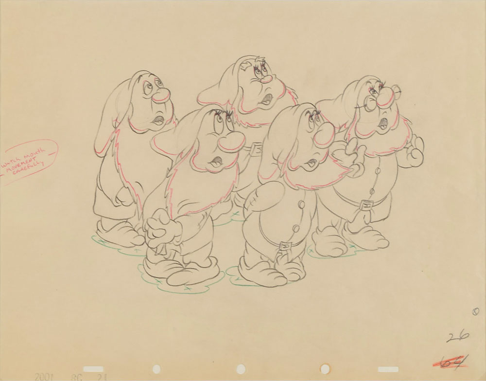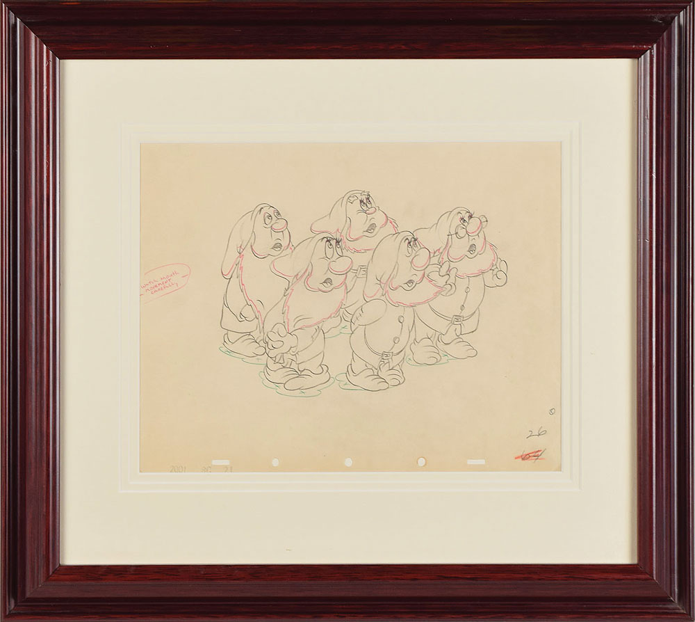 (Walt Disney Studios, 1937) Original production concept drawing featuring five dwarfs from Snow White and the Seven Dwarfs, showing them huddled together and looking skyward with their mouths open. An interesting animator's note to the left side reads, "Watch mouth movement carefully." Accomplished in graphite and colored pencil on off-white animation paper. Total image measures 7.75 x 5.5, with a mat opening of 11.5 x 9. Framed to an overall size of 19 x 17. In fine condition.