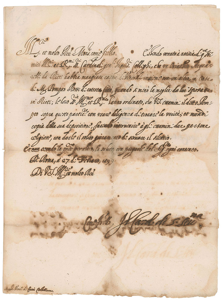 Powerful cardinal and advisor to several popes, who was feared as an inquisitor (1532-1602). He led proceedings against Campanella and Henry IV of France, and was responsible for the condemnation of the philosopher Giordano Bruno, who had been burned as a heretic ten days before this letter. Untranslated LS in Italian, signed “Il Card. di Si Sev'na,” one page, 8 x 11, February 27, 1599. Untranslated letter as Roman Grand Inquisitor to the Bishop of Civita Castellana. In very good condition, with some ink erosion to the text and signature, and staining along the intersecting folds.